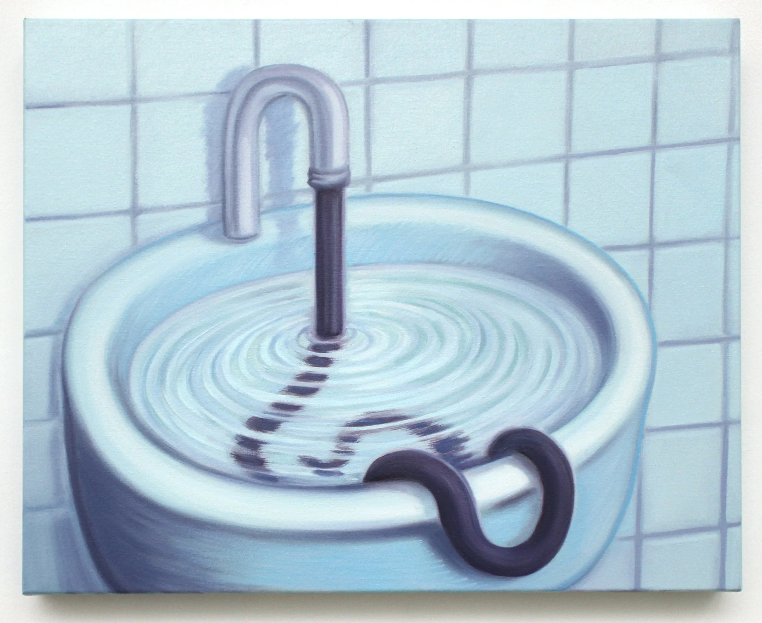 Peinture d'un lavabo avec un robinet et un serpent émergeant de l'eau sur un fond de carreaux bleus. Lise Stoufflet Voir en taille réelle